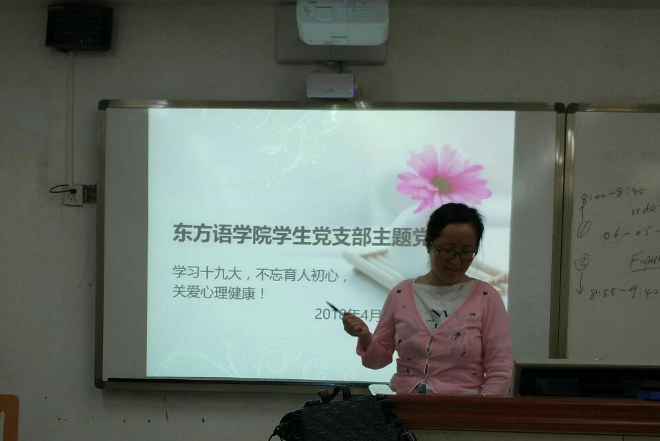 2018年4月12日中午12:30在教学楼B10148365365.com学生党支部进行的主题党日活动。本次活动主题为《学习十九大,不忘育人初心,关爱心理健康》,主持人是48365365.com辅导员兼学生党支部书记包淑萍,参加活动的主体是48365365.com学生党员代表和本科生2015级、2016级11个班的心理委员。
